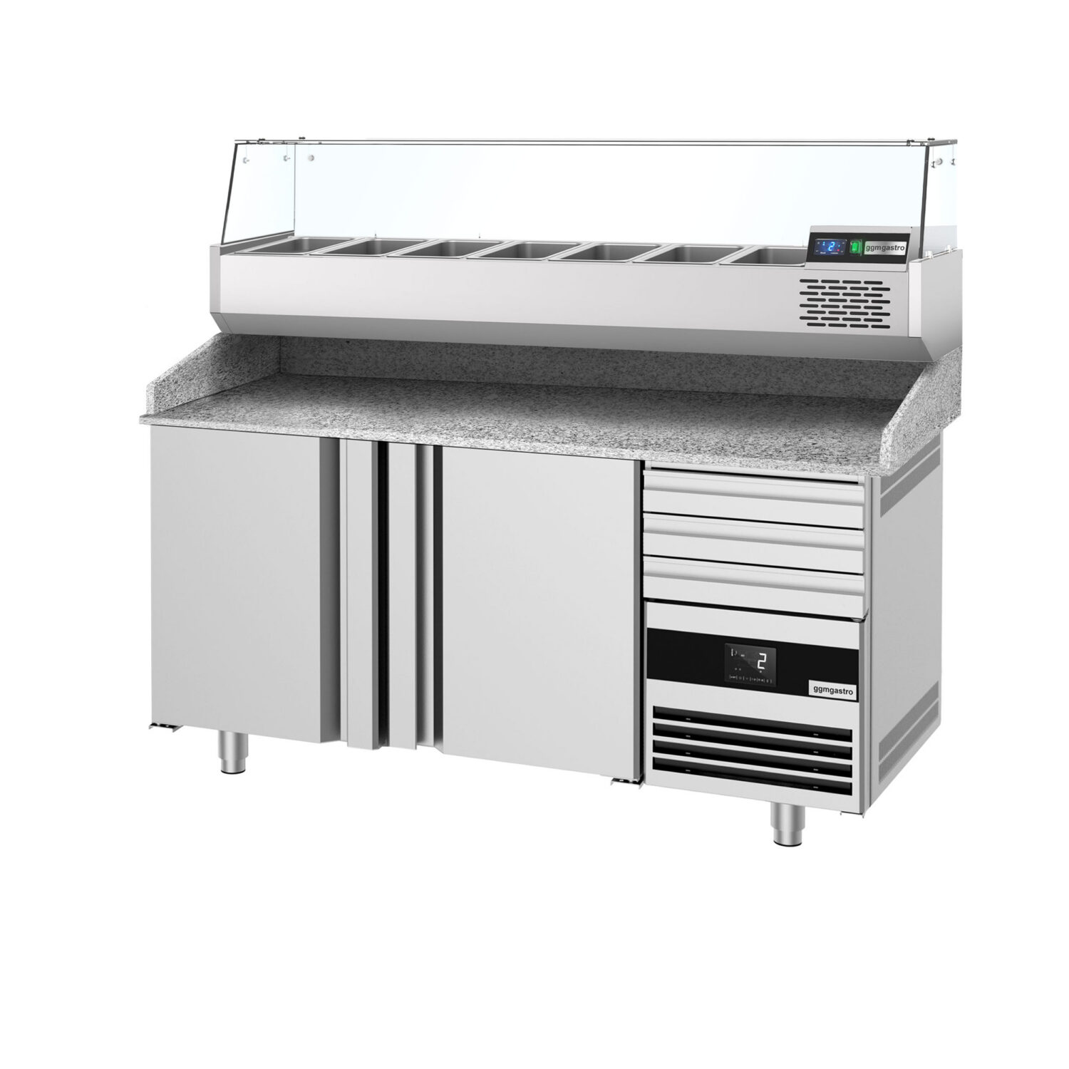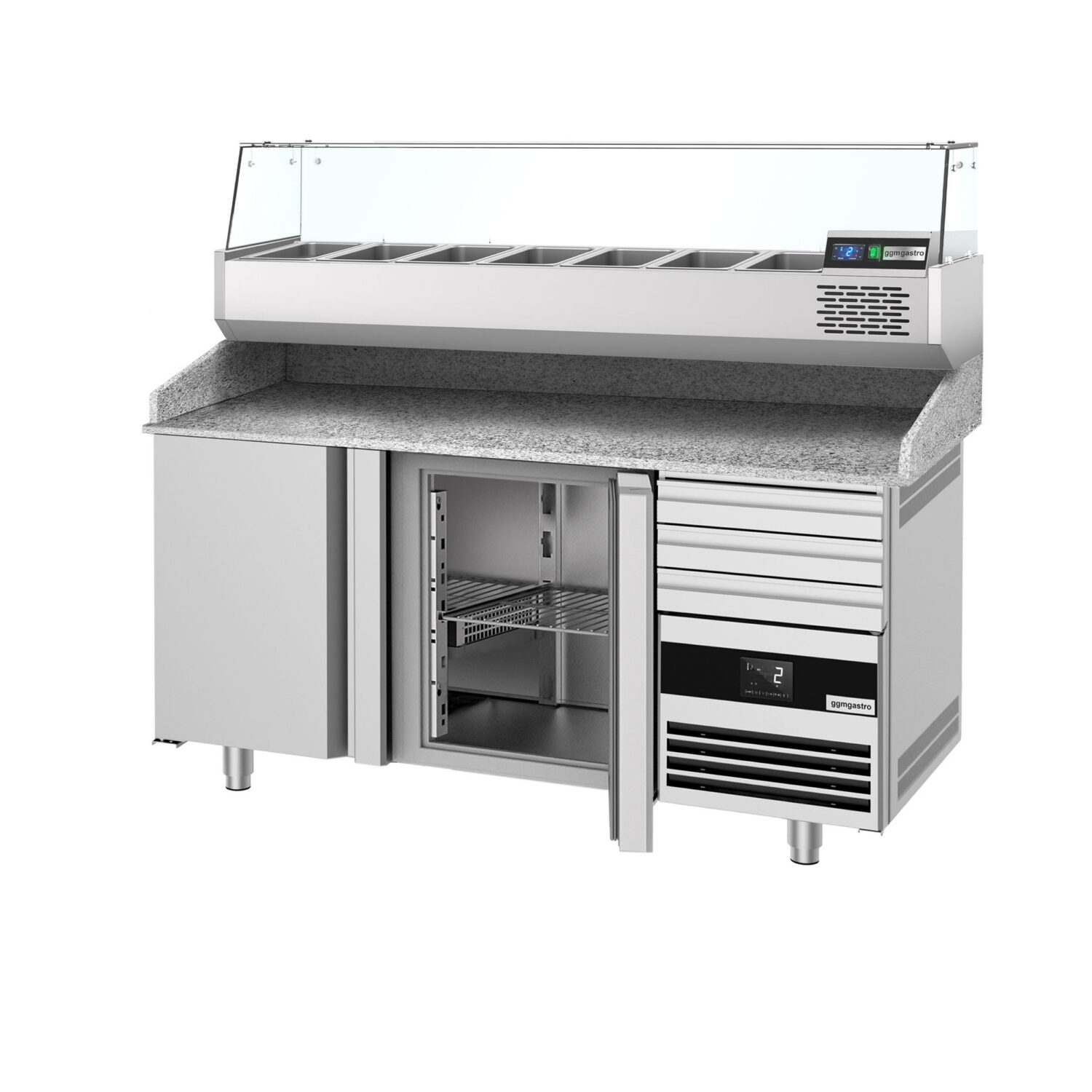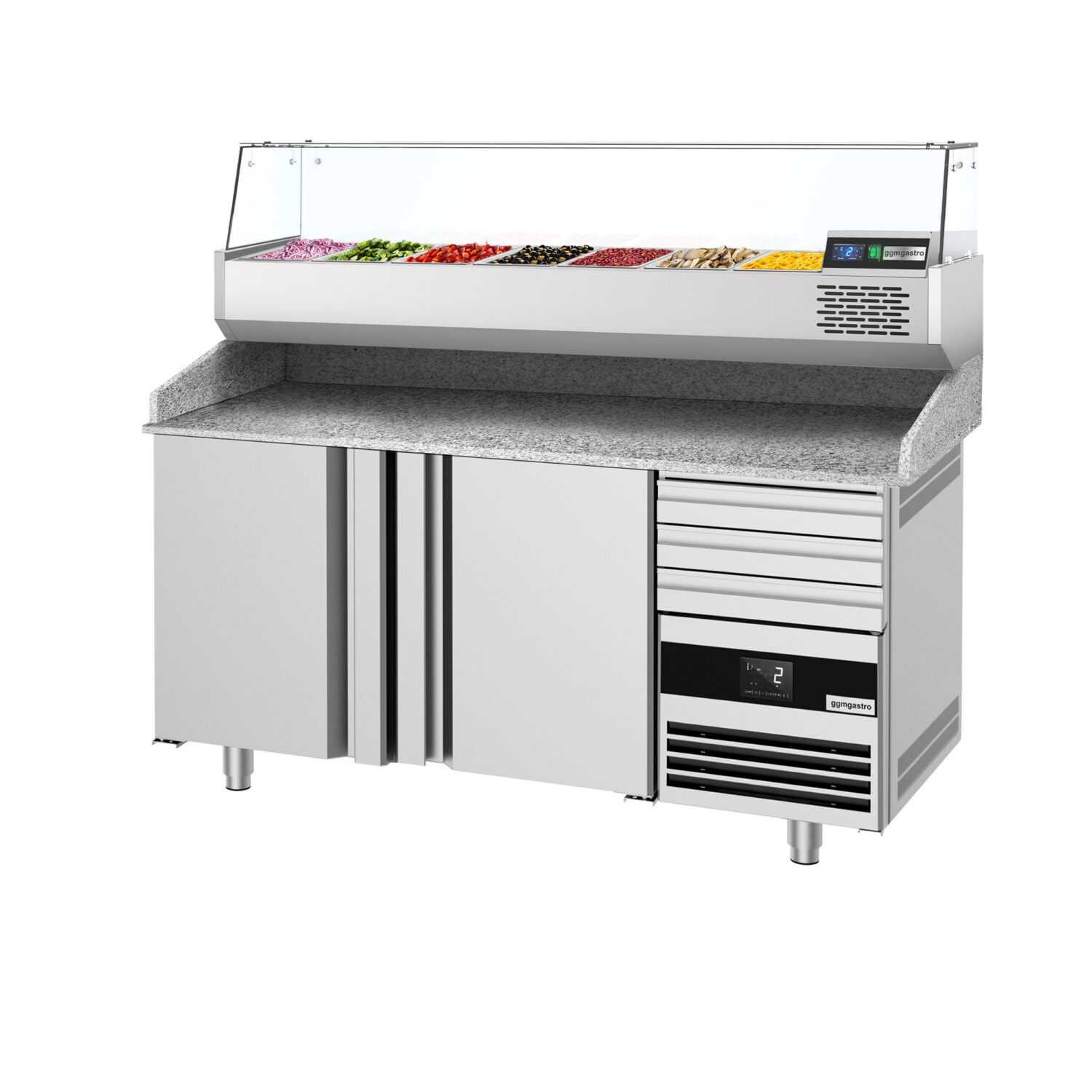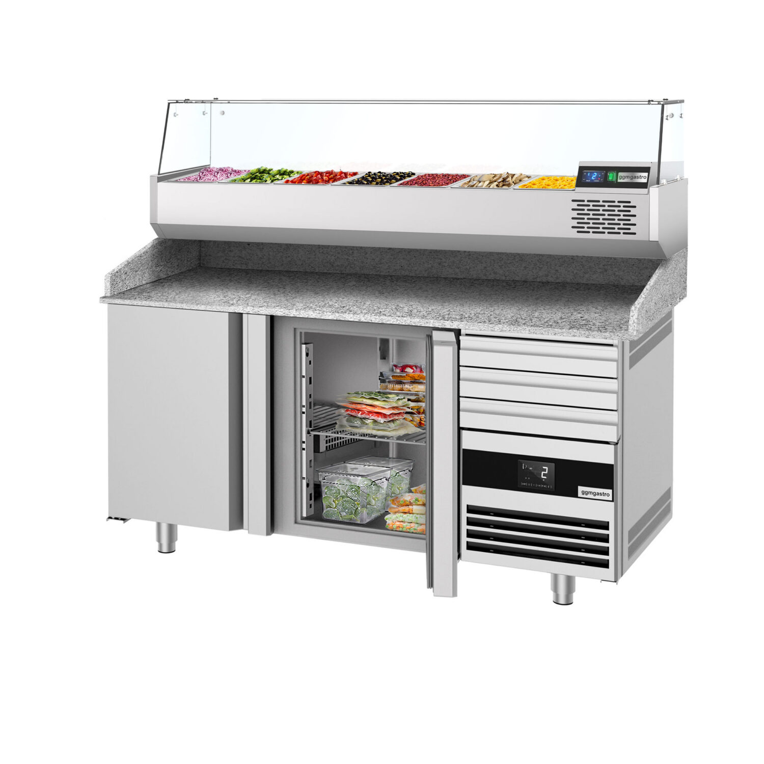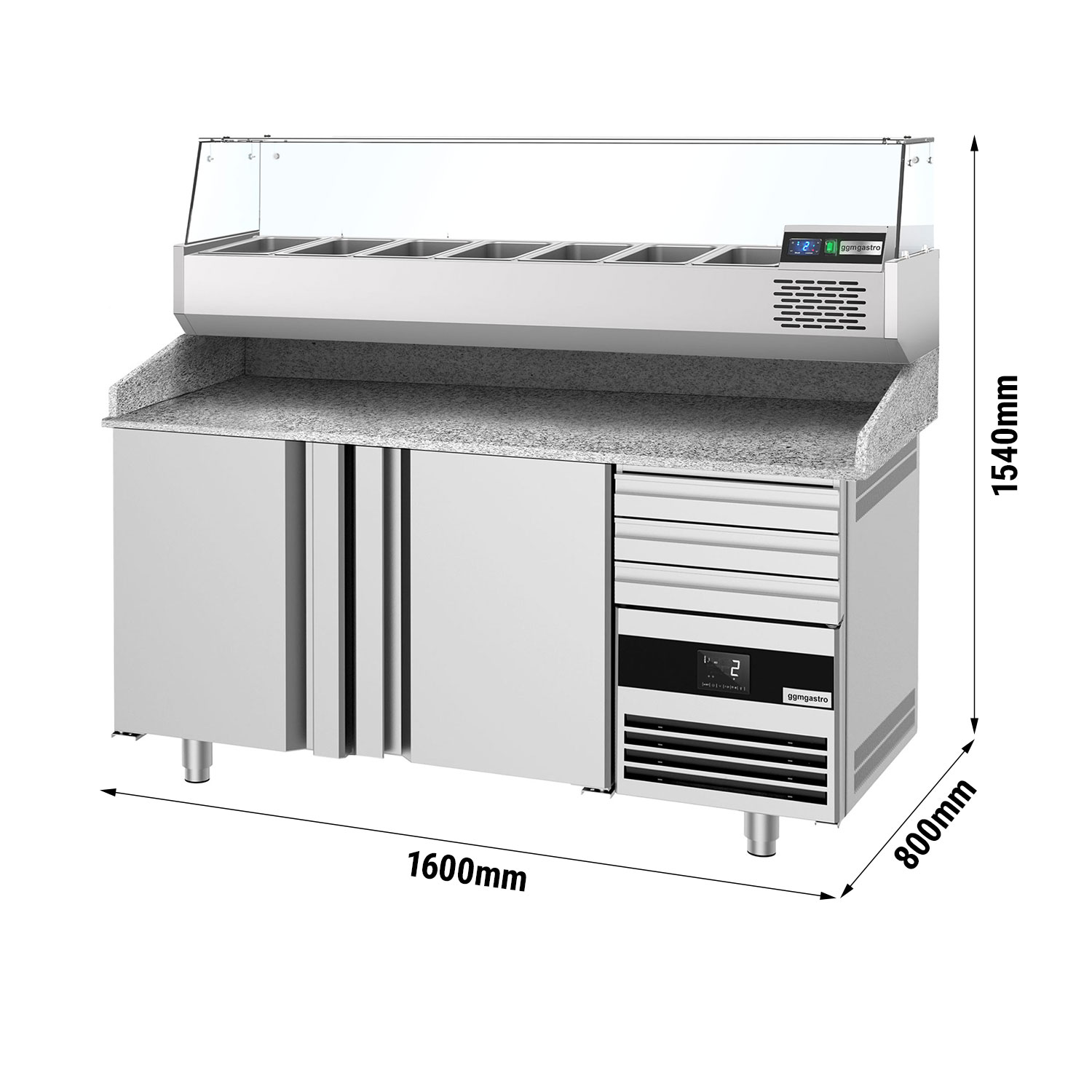 Pitsakülmtöölaud PREMIUM – 1600x800mm – 2 ukse ja 3 sahtliga – koos külmvitriiniga – 6x GN 1/3 [POF168S-EF#AGF164N]